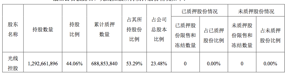 截止到3月5日,光线控股累计质押股数较2019年年报时下降至6.89亿股,质押比例占其所持股份比例下降至53.29%,占公司总股本比例的23.48%。