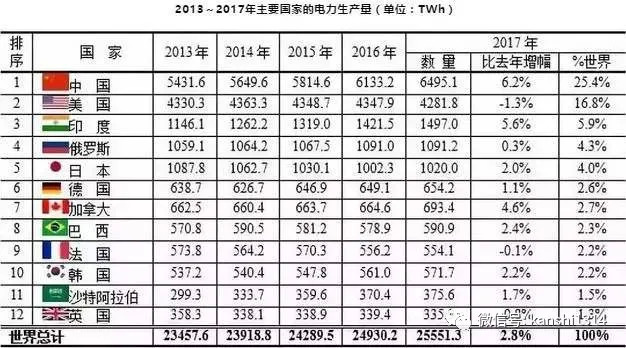 所以,工业的一个重要“原材料”,是电。1985年的时候,中国的发电量还不到美国的八分之一,排名全球第五,在美国、苏联、日本、德国、加拿大之后,但到了十年前,也就是2010年的时候,中国的发电量,已经占到美国的95%,排名全球第二。而到了2017年,中国的发电量已经是美国的160%,占全球总发电量的接近25%。