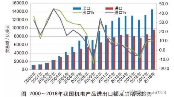 中国现在是全球第一大货物出口国,我们抛去轻工业产品,在中国出口的所有商品里面,超过50%的是机电产品,2018年中国机电产品出口额为1.46万亿美元,同比增长10.6%,占全商品出口总额的58.7%。要知道早在2009年,中国就已经超越德国,成为全球第一大机电产品出口国。