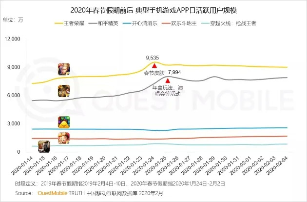 2020年2月QuestMobile TRUTH中国移动互联网数据库显示王者荣耀、和平精英的用户规模均迎来30%以上增长