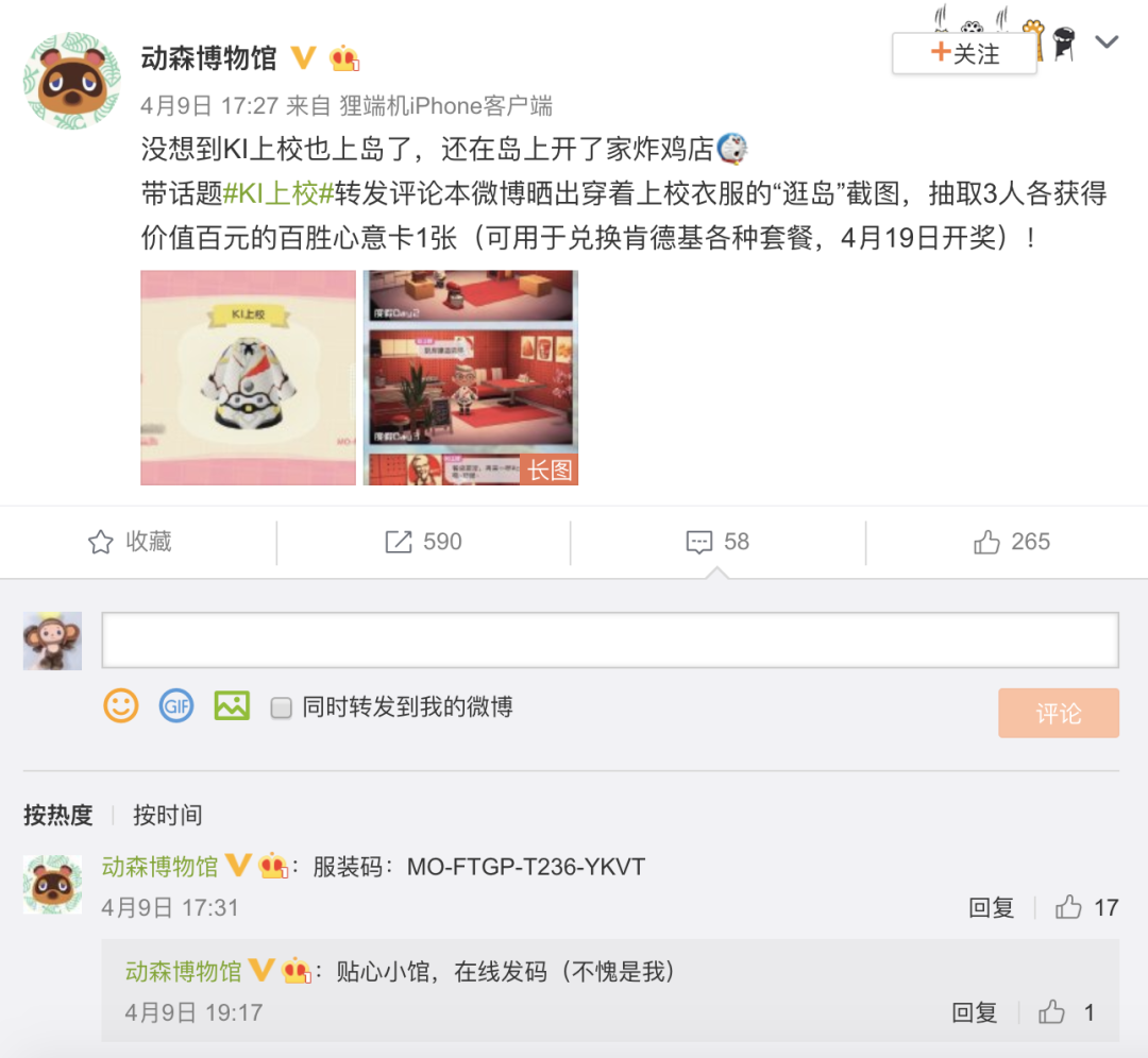近期大热的游戏《集合啦动物森友会》在发售后迅速成为年轻人之间的热议话题,肯德基立刻抓住了这个热点,让KI上校登岛开起了炸鸡店,并邀请其他玩家前来拜访。在游戏外,肯德基与微博KOL@动森博物馆 合作,推出互动活动,玩家晒出穿着上校衣服的“逛岛”截图即可赢取套餐兑换券。