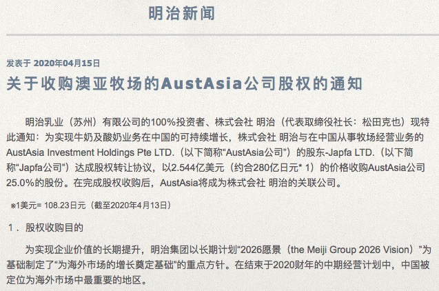 4月16日,明治乳业(苏州)有限公司网站发布一则对中国牧场的收购消息:为实现牛奶及酸奶业务在中国的可持续增长,明治乳业(苏州)有限公司的100%投资者、株式会社明治与在中国从事牧场经营业务的AustAsia Investment Holdings Pte LTD.(下称“AustAsia公司”)的股东-Japfa LTD.(下称“Japfa公司”)达成股权转让协议,以2.544亿美元(约合280亿日元、18亿人民币)的价格收购AustAsia公司25.0%的股份。在完成股权收购后,AustAsia将成为株式会社明治的关联公司。