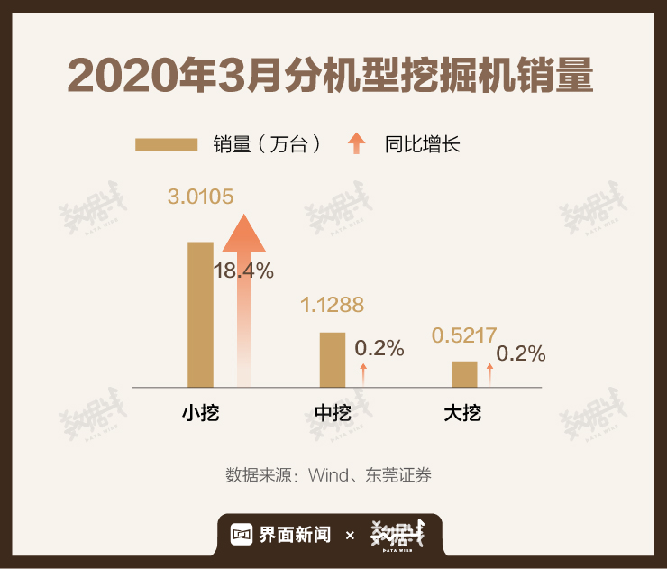 分机型来看,受益于新农村建设,3月,小挖实现快速增长,销量达到3.0105万台,比中挖、大挖分别多出约1.88万台和2.49万台,同比增长达18.4%。