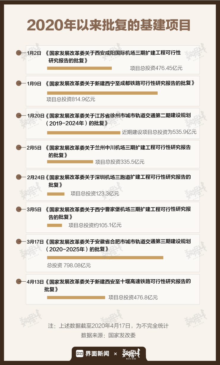 东莞证券分析称,随着基建和房地产项目的陆续开工,预计未来中、大挖需求有望持续增加。据界面数据不完全统计,截至4月17日,今年以来国家发改委已至少批复了8项基建项目,项目总投资额达到3666.03亿元。