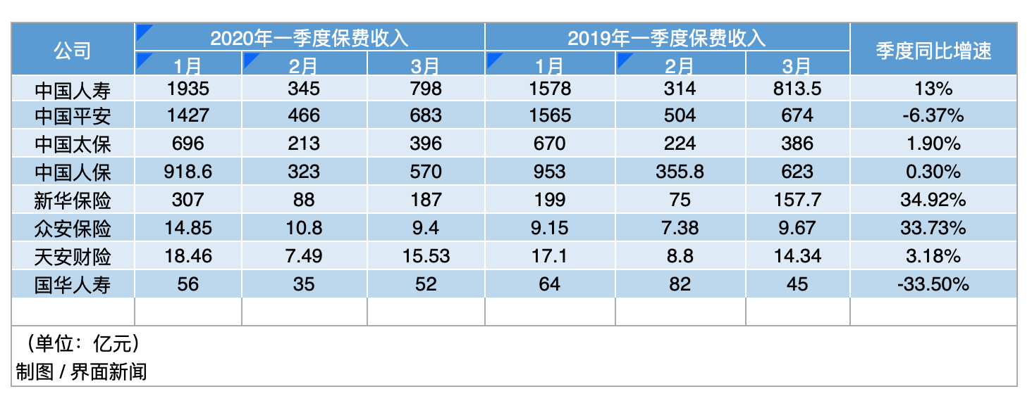 除此之外,中国平安、国华人寿则收到疫情影响,保费收入未能超过去年同期。
