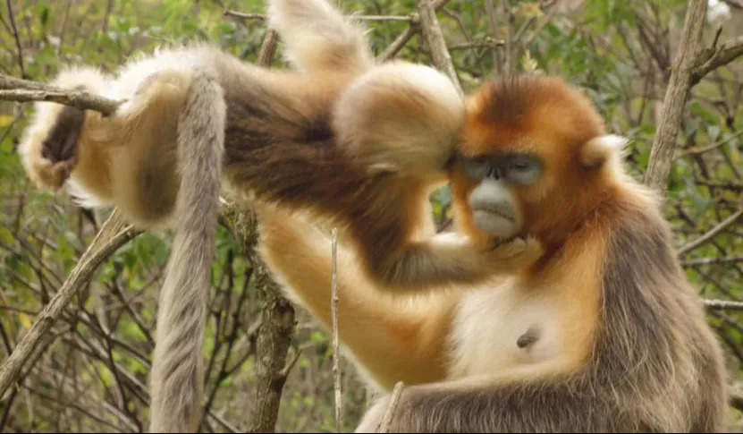 小金丝猴与妈妈在树枝上玩耍(范鹏来拍摄)