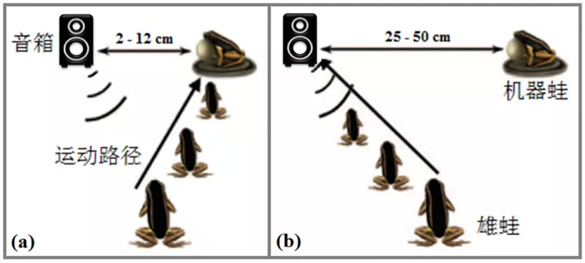 为了回答这个问题,科学家准备给一种幽灵箭毒蛙(Epipedobates femoralis)表演“双簧”。喇叭负责播放雄蛙的叫声,机器蛙负责呈现同步伸缩的鸣囊,记录雄蛙看完“双簧”后的行为反应。结果发现,当喇叭和机器蛙相距12 cm以内时,雄性箭毒蛙会攻击机器蛙(图5a)。很显然,它们误以为声音是机器蛙发出的——雄性箭毒蛙跟我们一样也懂“腹语”。直到喇叭和机器蛙相距较远(超过25 cm)时,它们才意识到原来声音是从机器蛙旁边的喇叭发出来的,从而改变路线去攻击喇叭(图5b)。