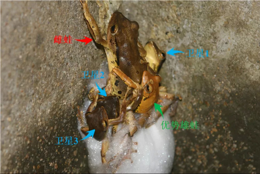 观察发现斑腿泛树蛙(Polypedates megacephalus)在繁殖时,会有多只“卫星”雄性悄悄地尾随已经抱对的雌蛙。在雌蛙背着心仪的雄蛙寻找合适的产卵点的过程中,“卫星”雄性始终与雌蛙保持一段距离。直到抱对的雌蛙开始排卵,这些“卫星”雄性才会蜂拥而上,齐刷刷地扒在雌蛙身上,趁机将自己的精子混在卵泡里面。这个时候对于不堪重负的雌蛙而言,摆脱“卫星”雄性已经为时已晚。
