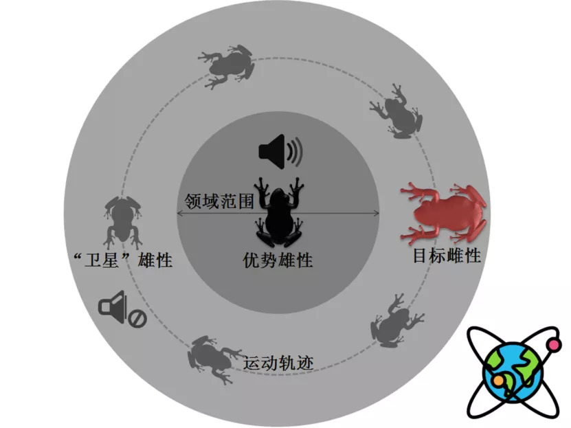 优势雄性(黑色)会在自己的领域范围(深灰色圆区)内卖力鸣叫,呼唤雌性前来交配。劣势雄性(灰色)会在优势雄性领域四周的灰色地带(浅灰色环形区)游走,很像在行星周围绕行的卫星(右下角所示),因此被形象地称为“卫星”雄性。