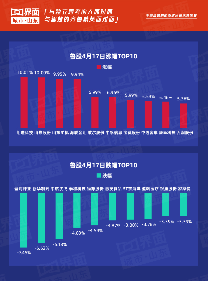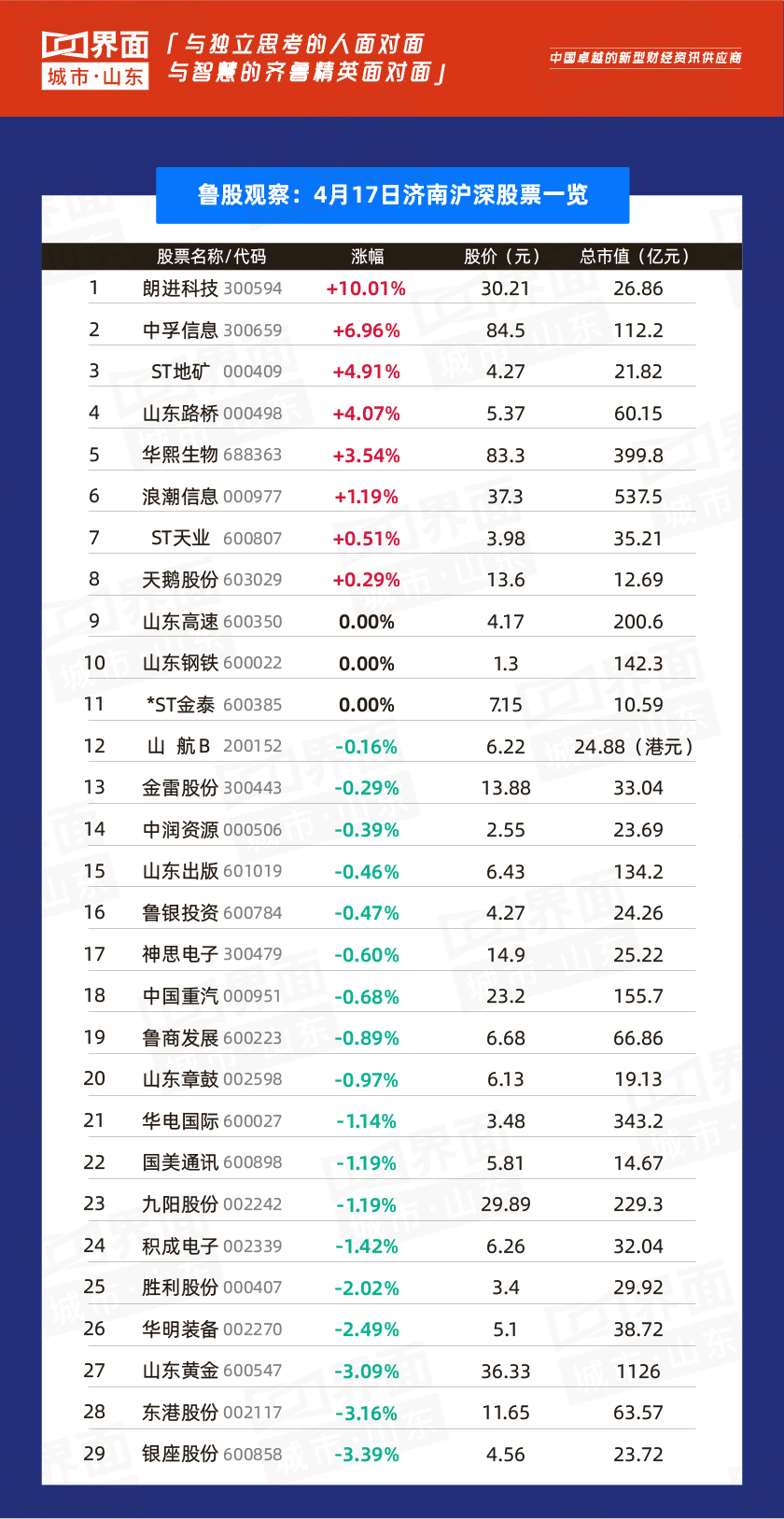 4月17日,山东省内沪深股票有84只个股上涨,111只下跌,13只与上一个交易日收盘价持平;