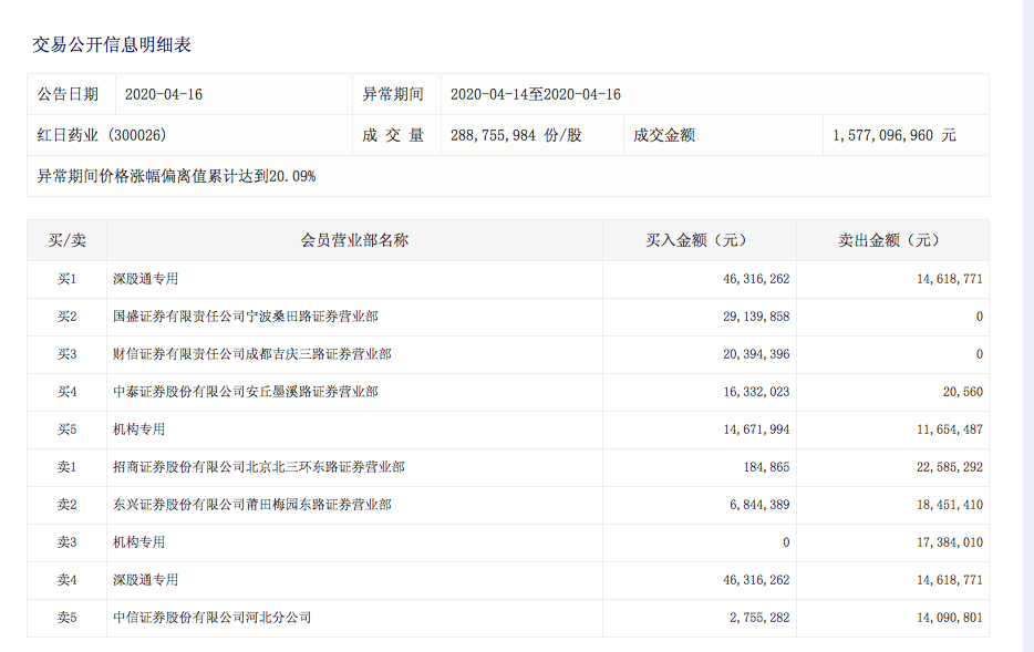 4月16日,红日药业因异常期间价格涨幅偏离值累计达到20.09%登上深交所龙虎榜,4月14日-4月16日期间成交金额达到15.77亿元。盘后数据显示,期间深股通买入4631.63万元,卖出1461.88万元;机构专用席位买入1467.2万元,卖出1165.45万元,机构交易频繁。