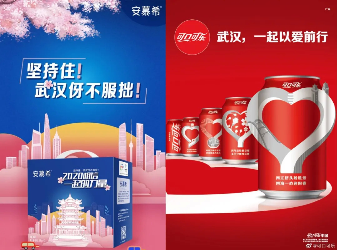 最为常见的形式便是通过捐款,多家品牌在疫情发生之后,都勇担社会责任,积极捐款献爱心。除了捐款以外,也通过特别包装来为武汉加油。其中,伊利安慕希推出限定武汉加油包,相信一起的力量;可口可乐为武汉专门定制了4个告白系列罐,一起以爱前行。