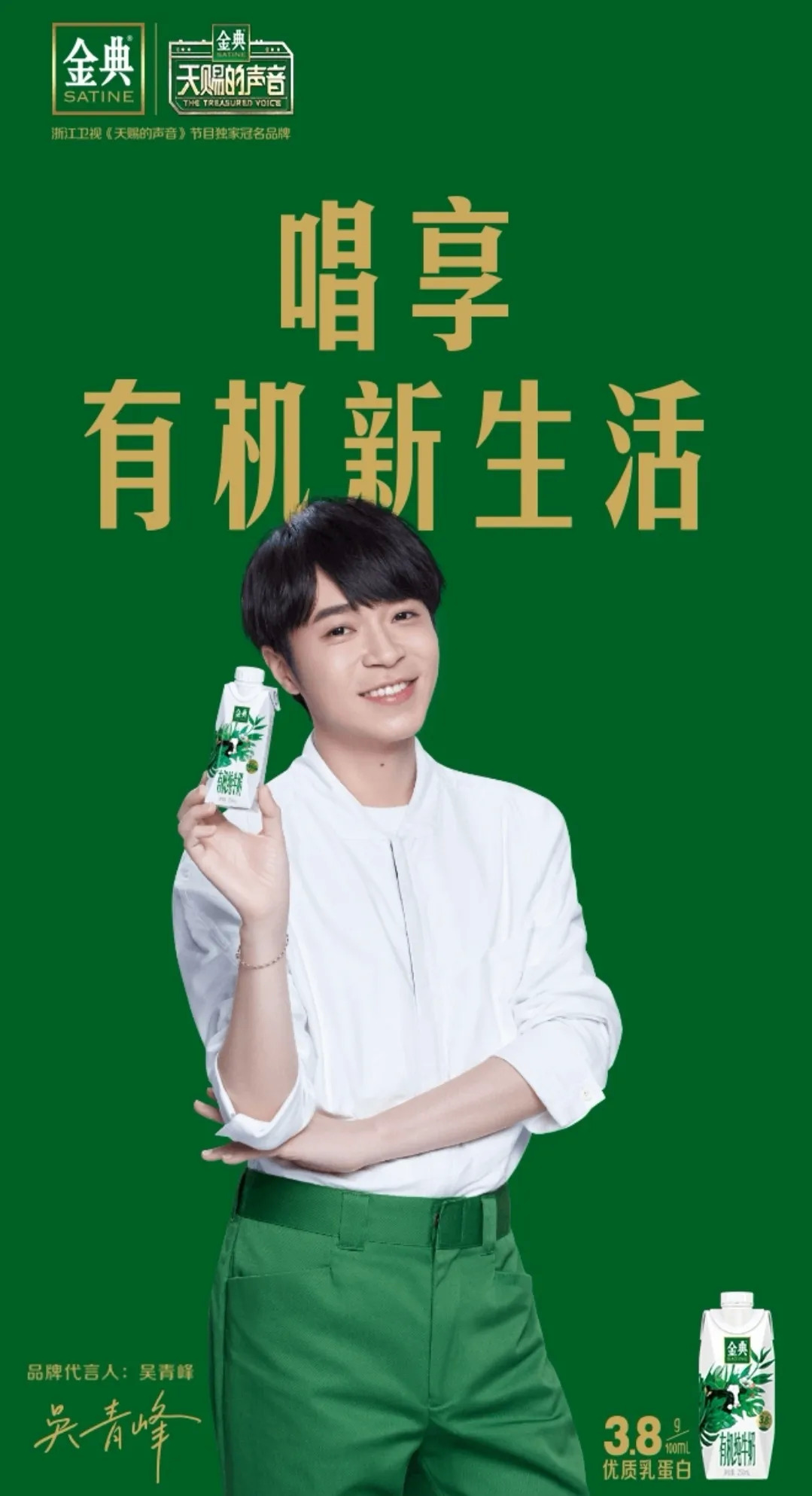同样,自金典与《歌手2019》合作之后,当时的串讲人吴青峰便成为了该品牌代言人,而今年当金典选择了新节目《天赐的声音》后,吴青峰也即将以飞行嘉宾的身份加入该节目录制。