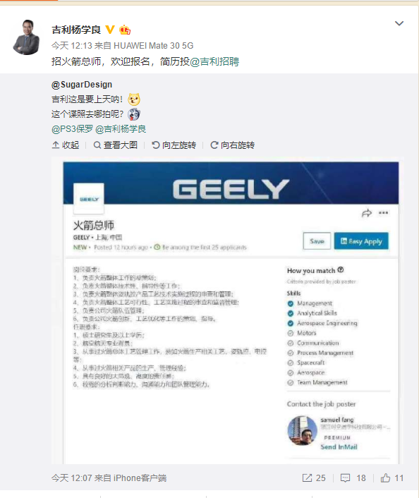 《科创板日报》17日讯,日前有网友发现了一则吉利科技集团下属公司浙江时空道宇科技有限公司招聘火箭总师的信息,并在社交网站上进行求证。对此,吉利汽车集团副总裁杨学良证实吉利将涉足 " 火箭 " 领域。