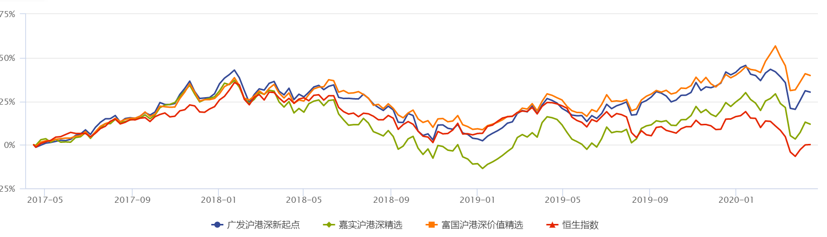 从上图可以看到,三只基金近三年表现都跑赢了恒生指数(红色),其中业绩最优的是富国沪港深价值精选(橘色,近三年收益40%),其次是广发沪港深新起点(蓝色,近三年收益30%),最次是嘉实沪港深(绿色,近三年收益12%)。