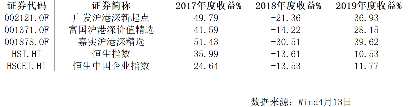 由于东证资管的沪港深基金实际以A股投资为主,本文重点在于分析港股基金,故而选取的是目前市场中规模最大且偏重港股投资的产品,包括广发沪港深新起点、嘉实沪港深精选、富国沪港深价值精选。它们的最新规模都超过了40亿元。