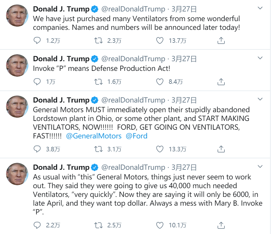 “通用汽车公司必须开始制造呼吸机,现在!”
