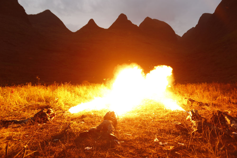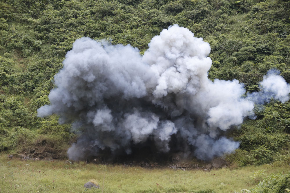 雷区的地雷被炸药引爆的瞬间。图片来源:都市时报 孟祝斌/视觉中国