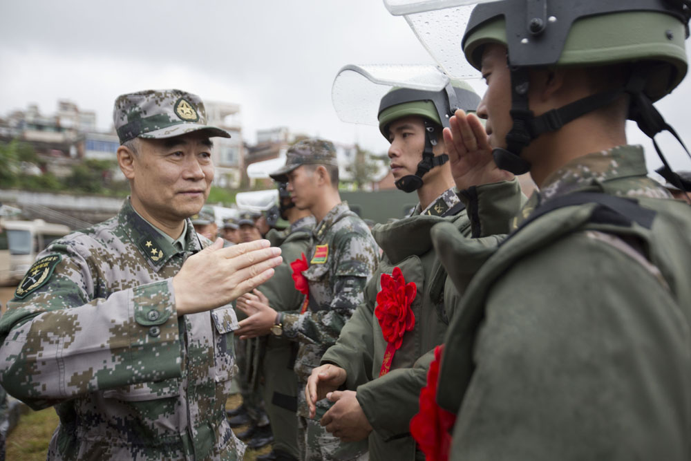 成都军区副司令员周小周将军为排雷的战友们送行。图片来源:都市时报 孟祝斌/视觉中国