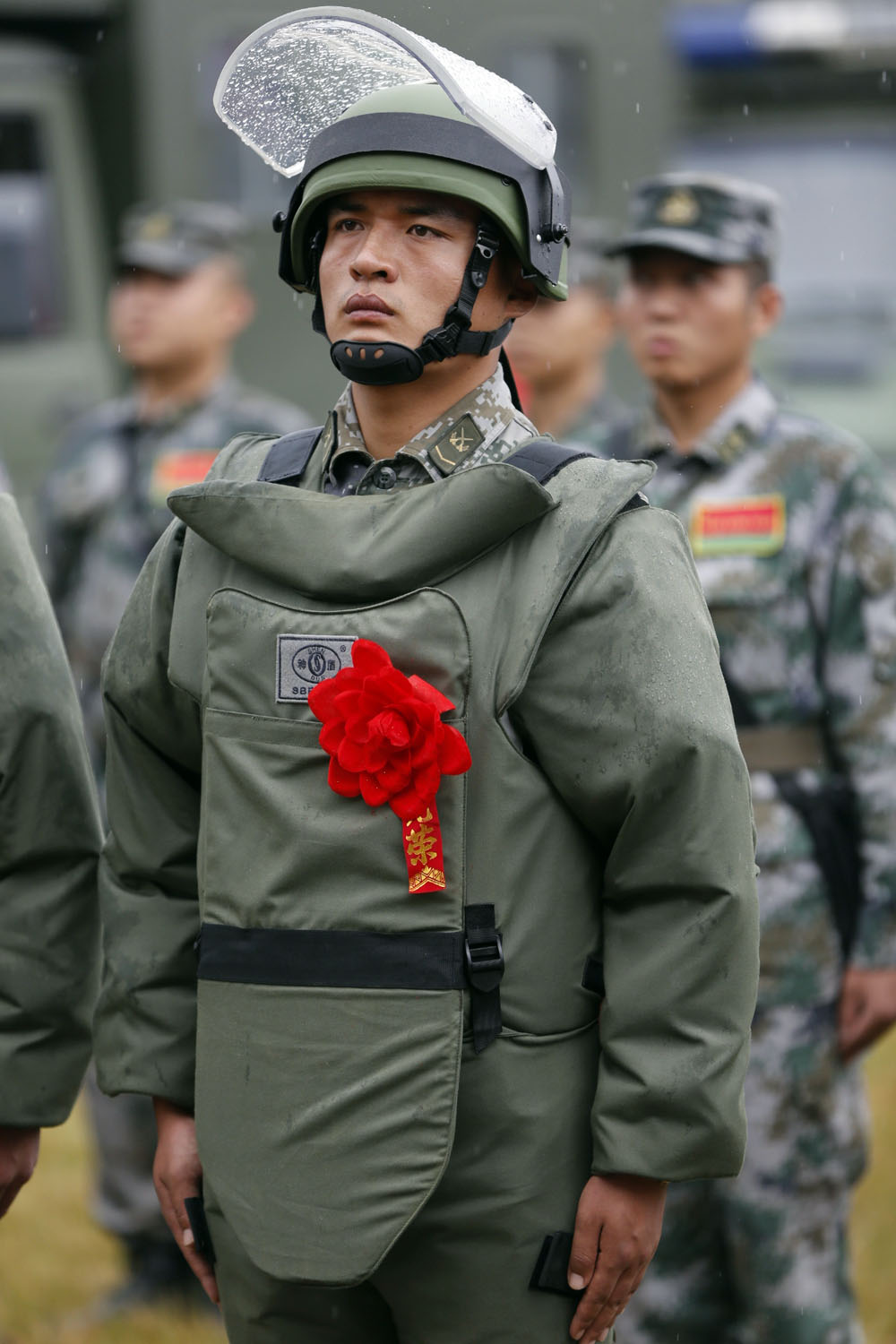 身带红花全副排雷装备的工兵即将出征。图片来源:都市时报 孟祝斌/视觉中国