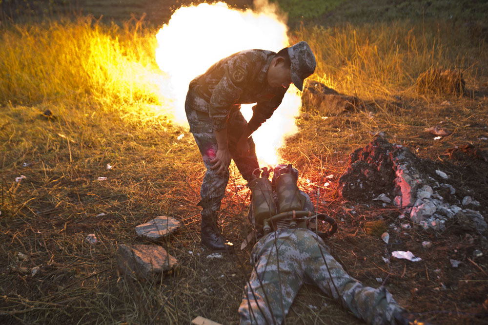 一对工兵扛着引爆地雷阵的炸药。图片来源:都市时报 孟祝斌/视觉中国