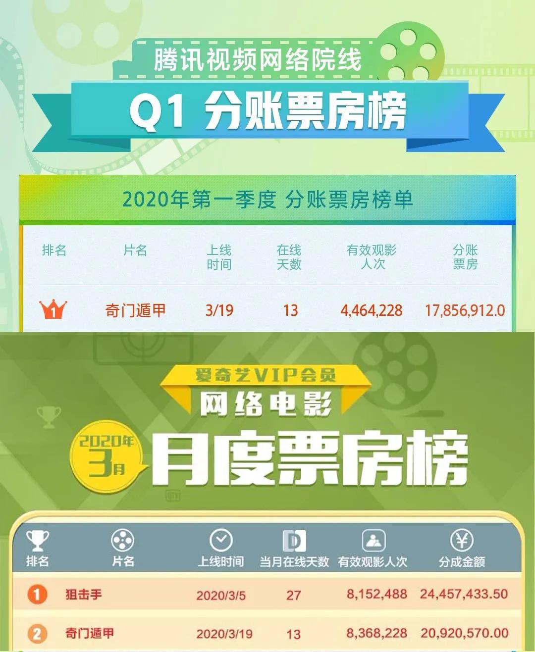 作为一部为数不多的双平台联播网络电影,根据平台公布的3月分账数据,在上线时间仅有13天的情况下,《奇门遁甲》便在腾讯视频取得了1785万分账票房,高居分账榜首;爱奇艺方面,该片以2092万分账票房获得了月榜第二名,同时也是爱奇艺目前的网络电影年榜第三。