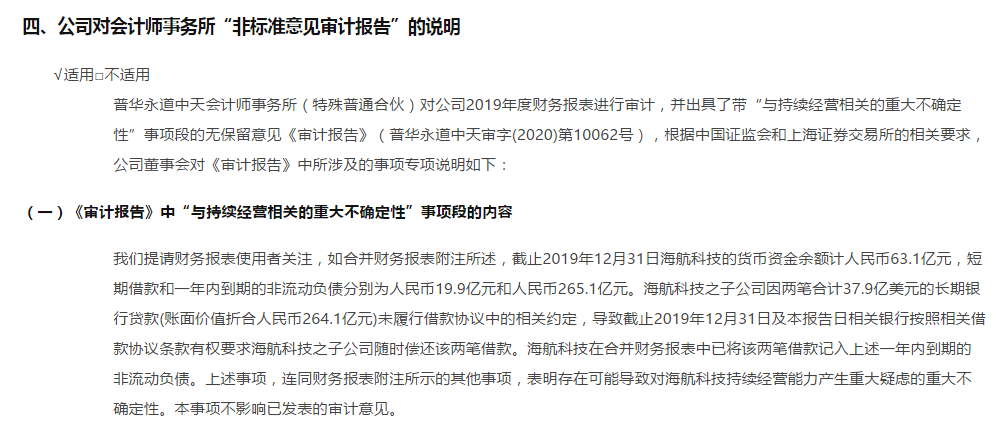 4月19日下午,海航科技(600751.SH)发布了2019年年度报告,审计机构普华永道对其年报给出了“非标意见”,即带“与持续经营相关的重大不确定性”事项段的无保留意见《审计报告》。
