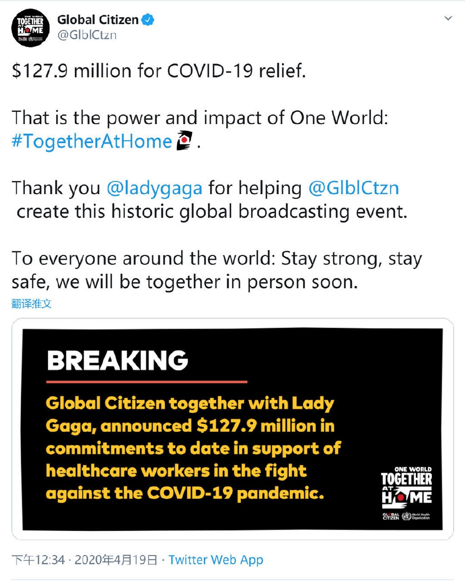 美国当地时间4月18日晚,由联合国世界卫生组织(WHO)与国际公益组织“全球公民运动”共同举办、Lady Gaga策划的“《同一个世界:团结在家》(One World: Together At Home)”慈善音乐会在全球网络及电视进行直播。据Global Citizen官方透露,该场演唱会已为世界卫生组织筹得1.279亿美元,这笔钱将会用来帮助世界各地的医护人员对抗疫情。