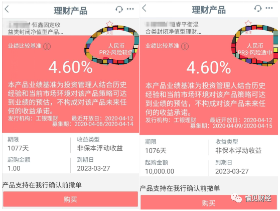 举例子更好说明问题。下图是某大行代销自家理财子公司的理财产品,一款是固收类、一款是混合类。