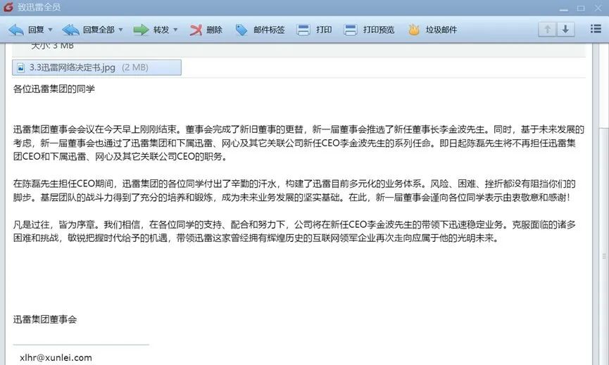 4月2号上午11点左右,深圳南山百度大厦西塔8楼,张平(化名)正在会议室,给项目组同事安排工作,突然电脑屏幕上跳出一封邮件,“致迅雷全员”,他扫了一眼,目瞪口呆,“老板被董事会开除了!”“第一个念头就是,我也要失业了。”而之前,他们没有听到任何风声。