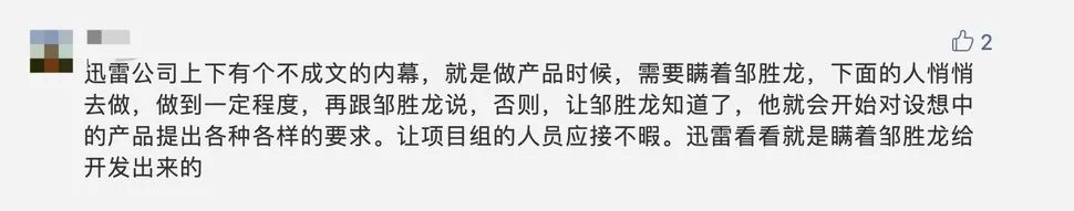 多名迅雷前员工反馈,在公司,如果邹老板盯上什么产品,这个产品绝对会烂尾。在迅雷历史上,比如迅雷6这样里程碑式的大版本,邹胜龙亲自抓每一个产品细节,最后不了了之,这个版本胎死腹中,没有上线。后来迅雷员工达成默契,要做什么新项目,不给邹胜龙汇报,先做出来再说,因为只要他知道,就一定要干预,干预就一定完蛋。邹老板的控制欲可见一斑。