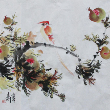 除了景致绝美,优秀的艺术作品更是让我大饱眼福,与众多艺术家一道同行,路上交谈甚欢,老师们的雅致和优秀画作也给我留下了很深的印象。比如擅长人物和花鸟的孟刚老师,观赏他笔下的人物,都仿若眼前而活灵活现。这次挥毫泼墨,许是远处的候鸟和采摘园的石榴带给了他灵感,孟刚老师精雕细琢出两幅花鸟,惟妙惟肖,若有灵性;