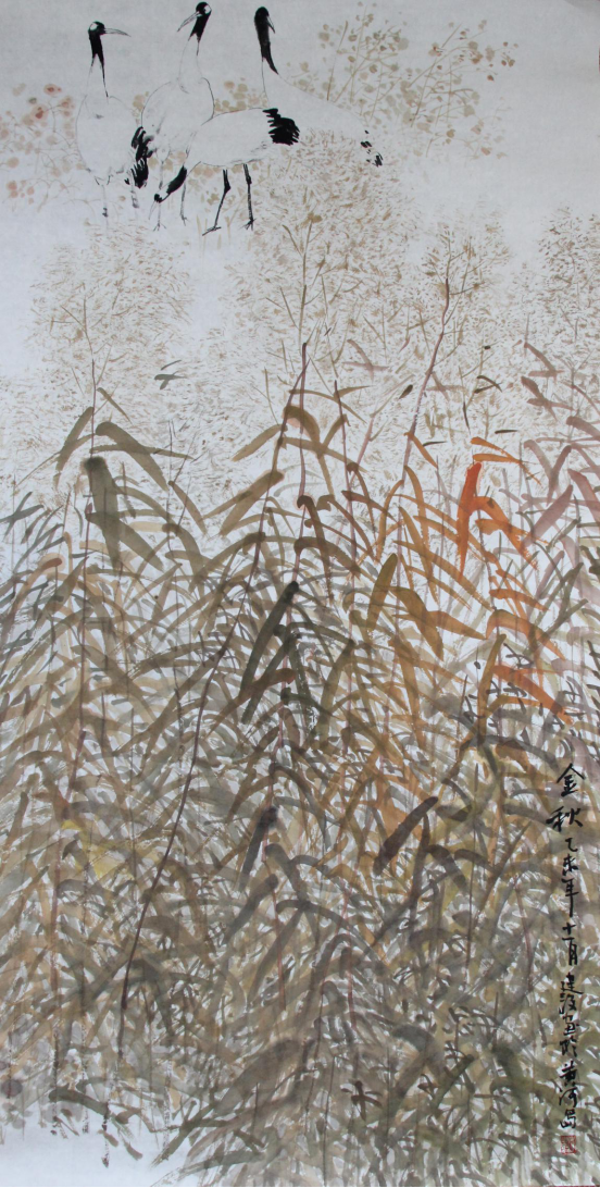 比如在山水上着墨甚多造诣颇深的李建设老师,更是感同身受,绘出芦苇和白鹤起舞的《金秋》。