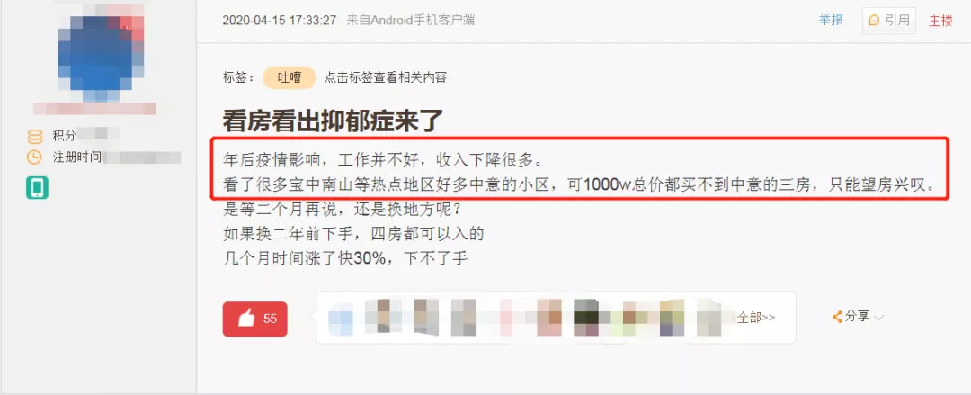 帖子说,因为疫情影响,收入下降了很多。现在手握500万,想在宝中、南山买三房,但一直都找不到中意的。