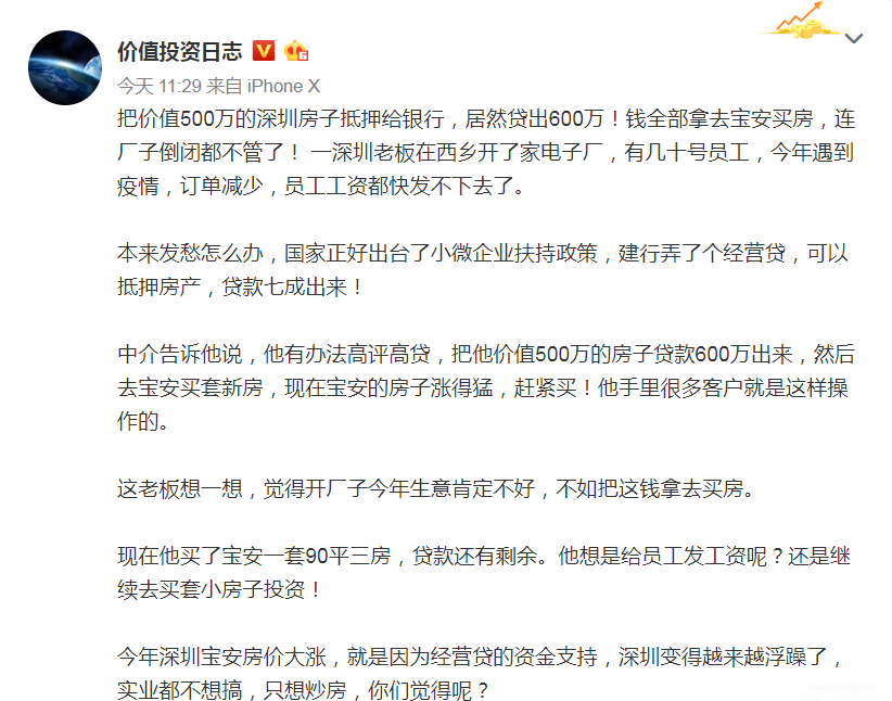 简单来说就是,很多人钻空子,利用原本支持小微企业,支持消费的政策,把资金套出来,然后去炒房。