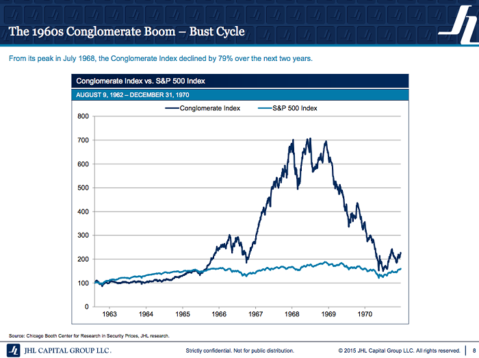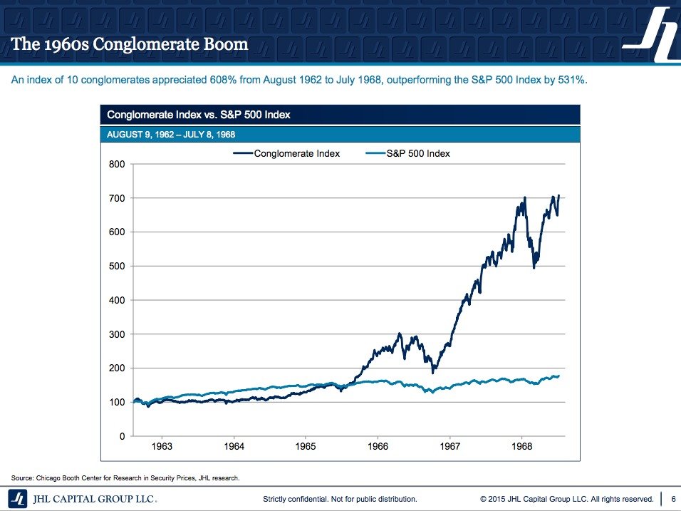 利廷斯凯认为,资本门槛较低推动了本世纪前10年的房地产投资和后金融危机时代的能源投资。而在上个世纪60年代,由于股权资本成本较低、市场对企业协同效应抱有高预期、企业增长机遇有限,投资者花费大量资金追求收购主导的增长模式。1962年至1968年期间,10家企业集团的股价指数上涨了608%,超过同期标普500指数531%的涨幅。