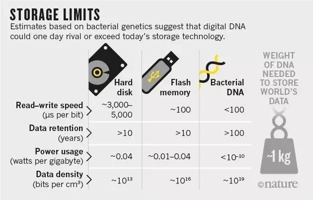 此外,最重要的一点就是,保存时间非常久。现在高密度的存储器都会随着时间推移而衰减,能存储时间最长的工具是磁带,其寿命也就50年,其他的存储器寿命更短。比较而言,DNA则保质期就以百年计算了,如果将其冷冻起来,能保存几千甚至上万年。