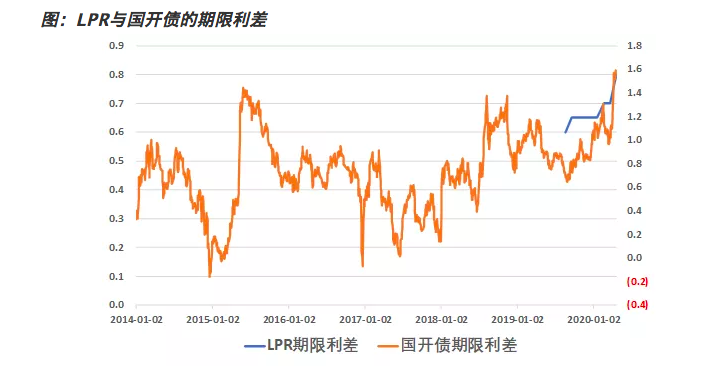 从下图可以看到,LPR的期限利差,与国开债的期限利差,是同步拉宽的。