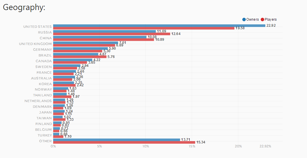 SteamSpy开发者Sergey Galyonkin曾经在一篇有关于Steam游戏价格的文章中提到:俄罗斯与中国两国,其国内的破解游戏数量十分庞大,导致这两个国家的游戏购买力非常低。但是一旦游戏的价格符合当地玩家的购买力和预期值时,结果就完全不一样了。在中国,购买正版游戏的玩家平均下来仅仅只有1%,但在国区定价只有美区一半的游戏《GTA5》上,这个数字涨到了10%。在Steam上GTA 5的总销量中,俄罗斯和中国占据了很大一部分的比重,这就很能说明问题:只要游戏的价格、本地化和市场处理都符合当地的国情,游戏的销量就会很可观。