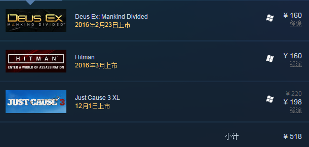 史克威尔·艾尼克斯今年年底到明年年初将要发售的跨年三大作:《正当防卫3(Just Cause 3)》、《杀出重围:人类分裂(Deus Ex:Mankind Divided)》和《杀手(Hitman)》的价格的还不到美区价格的一半,仅仅只要160元。其中《正当防卫3》还有预购的9折优惠,实际价格只要144元,算上季票也只要198元,而美区算上季票的价格打了折也高达76.48美元,约合人民币480元,这个价格已经快足够把这三个游戏全买下来了。