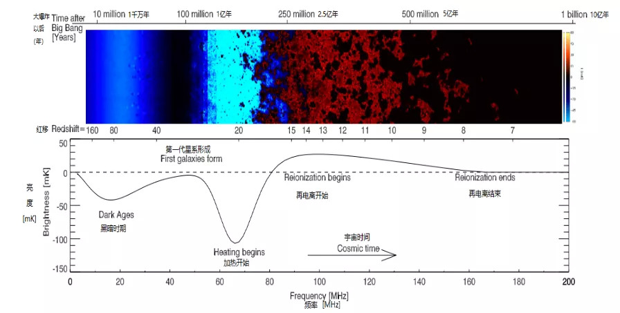 由于这种超长波会被地球电离层反射,因此在地球上迄今无法观测,对这个波长下的宇宙人类还知之甚少。这个波长对应于宇宙早期的黑暗时代(Dark Ages),因此可以用来观测这个时期的21cm信号,(如图2所示)探索早期宇宙的物理性质,这也可能是在外太空探测地外文明的很好手段。