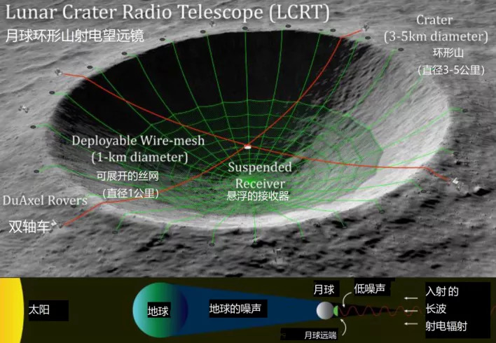 其一,月球本身是一个很好的物理屏障,能将来自地球电离层的无线电干扰/噪声,绕地球运行的卫星以及在月球夜晚期间太阳的无线电噪声隔离开来。要达到这个目的,这个望远镜必须建立在月球远端(即远离太阳和地球的月球背面)的环形山里。