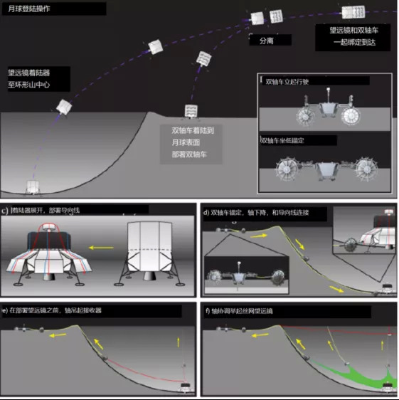 提案中详细描述了月球车在落地后如何建立这个丝网望远镜系统。如图3所示。计划使用壁攀双轴车以适当的深度与直径比在陨石坑中部署壁厚1公里的丝网,以形成球冠反射器。