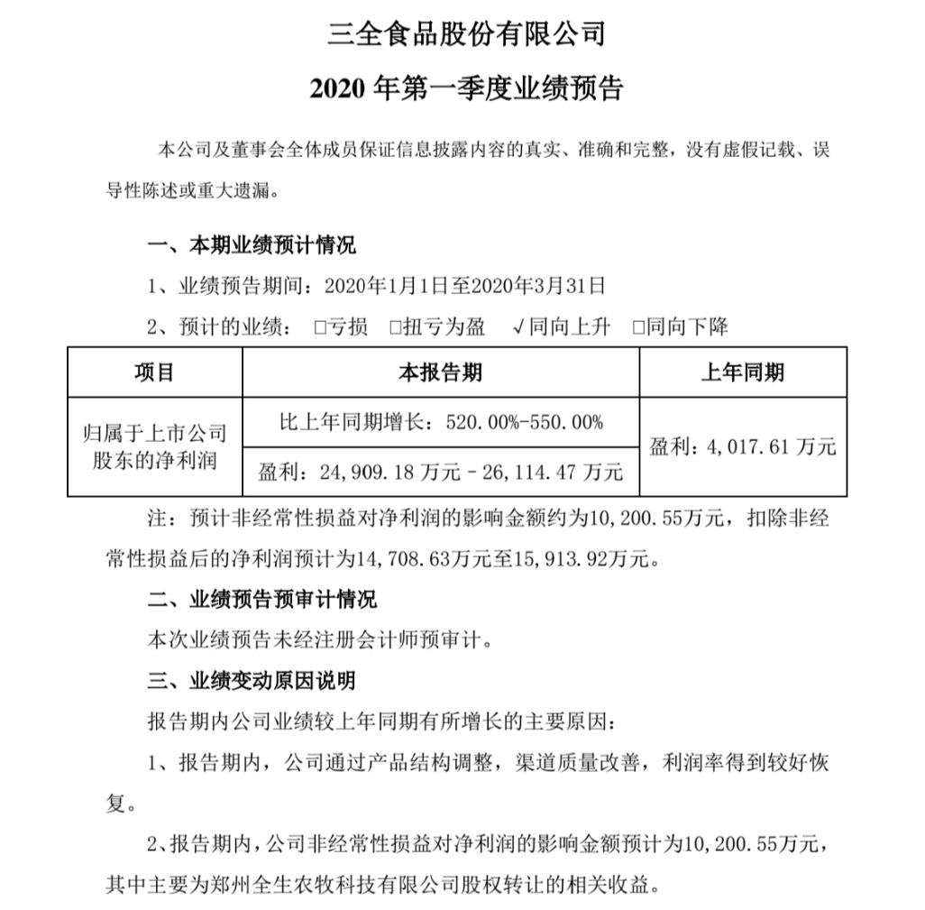 三全食品于4月8日发布的2020年一季度业绩预告显示,预计实现归属于上市公司股东的净利润为20909.18万元至26114.47万元,同比增长高达520.00%至550.00%。