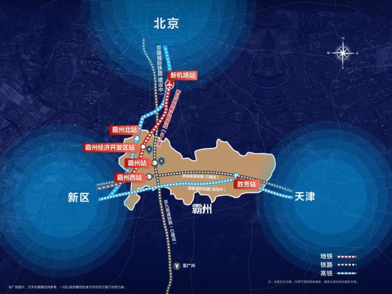 霸州位于京、津、雄三角地带,紧邻新区,规划有 8 轨 6 高速 5 站点,是目前唯一拥有两条高铁的县级市。作为环京的重要枢纽,霸州交通便利,四通八达,区域内已经形成了以高速公路、高速铁路、城际铁路以及省道干线为一体的立体交通网络,形成以霸州为主的发展区域。