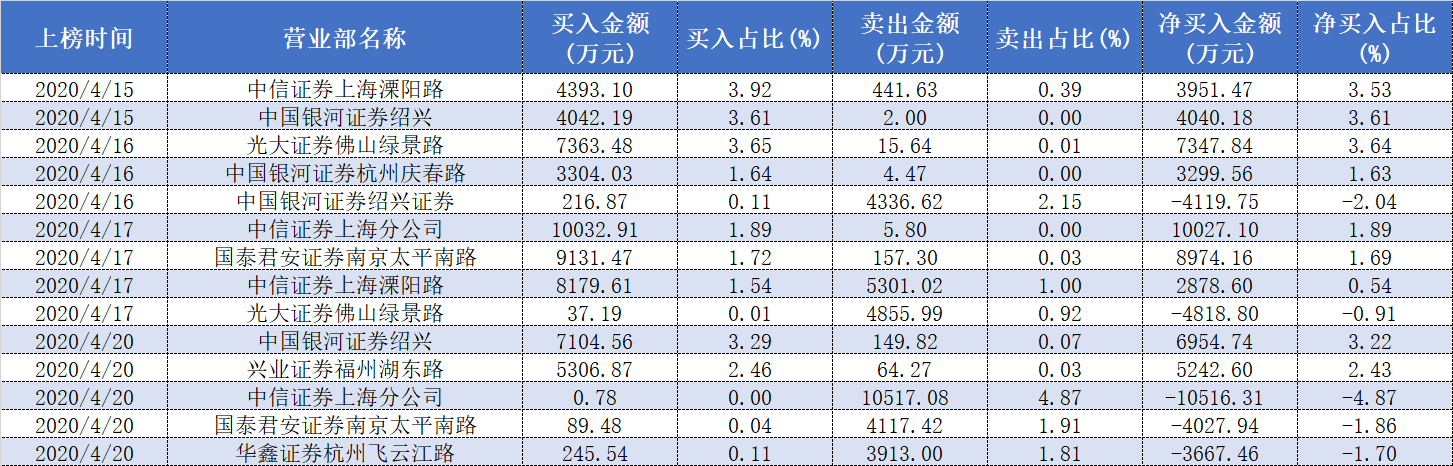 表格:4月15日-20日部分游资常用席位龙虎榜买卖金额情况