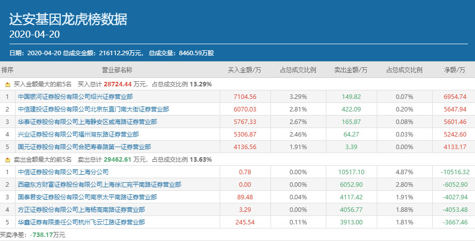4月15日,赵老哥的常用席位中国银河证券绍兴买入达安基因4042.19万元,次日卖出4336.62万元;4月16日,佛山系的光大证券佛山绿景路以7363.48万元的买入额居于该股龙虎榜买方首位,同日上榜的还有一线游资常用席位中国银河证券杭州庆春路,买入金额为3304.03万元。