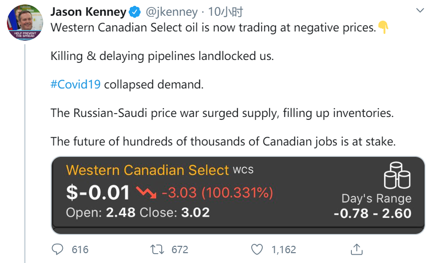 4月20日,加拿大艾伯塔省省长Jason Kenney在推特上贴出了一张油价截图,加拿大重油Western Canadian Select(WCS)以-0.01美元/桶的价格进行交易。