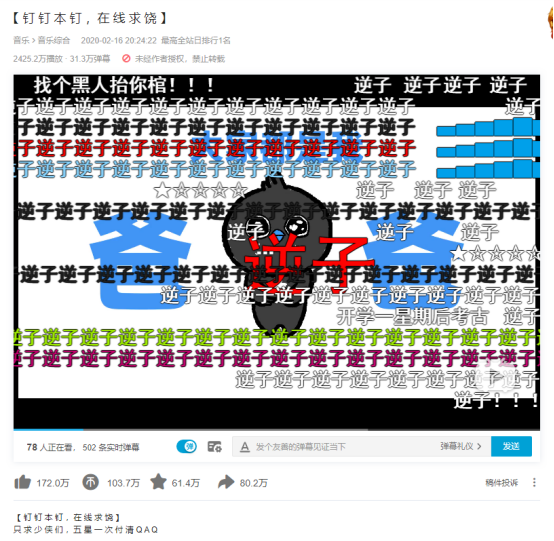 虽然差评无法阻挡钉钉一路走高的下载量,但作为一款社交软件,依然要考虑未来用户群体的好感度,因此,钉钉在年轻人聚集的B站发了一条视频,《【钉 钉 本 钉,在 线 求 饶】》,求各位少侠高抬贵手,“大家都是我爸爸”,满屏的“逆子”让学生群体泄愤的同时也不禁生出了对钉钉的好感,确认过眼神,好像还是自己人。