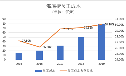 悉数2015年-2019年近五年海底捞的员工成本,海底捞的员工成本分别为15.72亿元、20.44亿元、31.2亿元,50.16亿元和79.92亿元,占海底捞年度收入的比例分别为27.3%、26.2%,29.3%、29.56%以及30.1%。海底捞的员工成本在节节攀升。